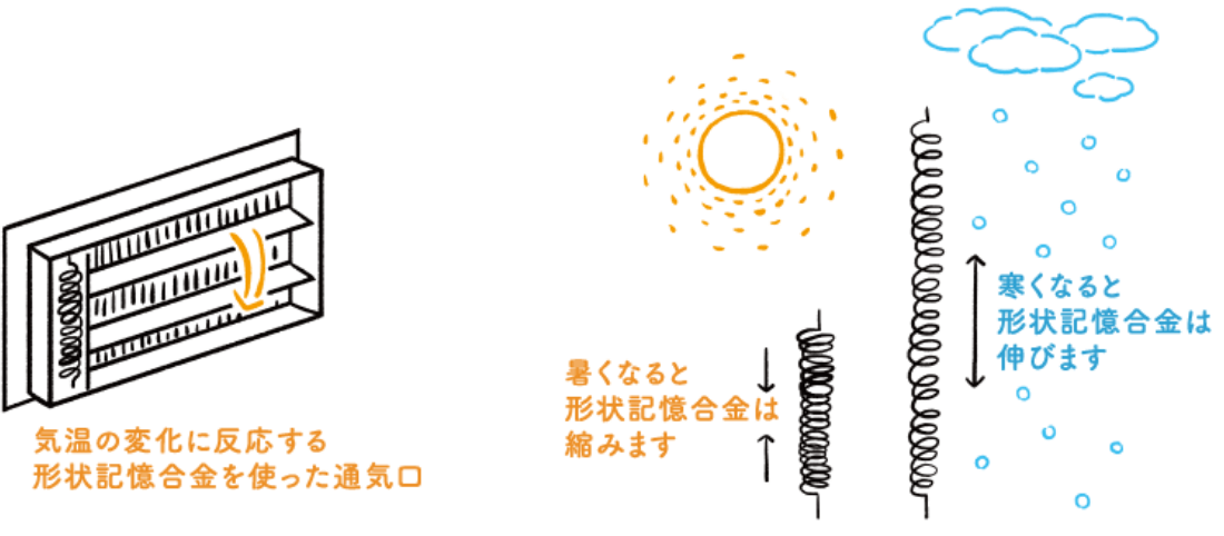 形状記憶合金を用いた通気機構が、夏は空気を通し、冬は断熱。