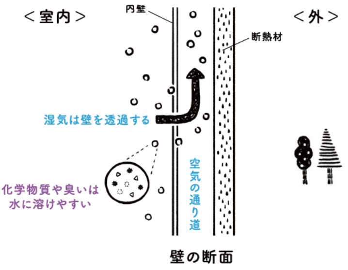 伝統的な土壁の知恵を応用し、化学物質や湿気を屋外へ排出。